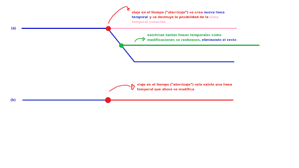 ¿Qué ocurre con la película? Básicamente, el problema de Looper es que mezcla las dos estructuras habituales de viajes en el tiempo conocidas gracias principalmente al cine y a la literatura. Al viajar en el tiempo y modificar un hecho del futuro o del pasado, o bien se crea otra línea temporal que elimina la posibilidad de que la línea antes conocida o esperada vuelva a suceder (a) o bien solo existe una línea que se modifica una y otra vez (b). Looper mezcla ambas, y no se puede. También obvia la necesidad de una máquina del tiempo en el lugar de llegada para realizar el viaje hasta el lugar de origen.
