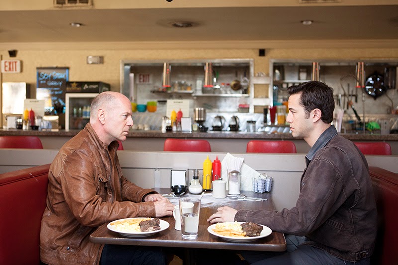 Hasta aquí todo bien (en realidad no, pero sigamos). La cosa se complica al llegar el momento del cierre de Joe. Su Joe del futuro (Bruce Willis, a partir de ahora Viejo Joe y en rojo) aparece, pero al contrario de lo acostumbrado, desatado y con la cara al descubierto. Derriba al Joven Joe(a partir de ahora en azul) y comienza una frenética búsqueda Terminatoriana del niño que en el futuro se convertirá en El Fundador (en verde desde ahora). El Fundador será el futuro presidente de la organización de los loopers, un despiadado tirano que cierra bucles sin piedad en el futuro y que, además, ordenará la muerte de Viejo Joe y provocará accidentalmente la de su mujer, hecho que motiva la rebelión de Viejo Joe.