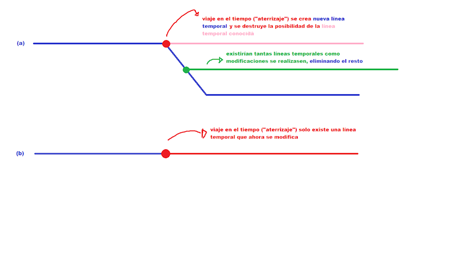 El único escenario posible en el que las acciones de Viejo Joe realizasen cambios para dar un futuro que Viejo Joe ya conoce es la opción (a) del dibujo. Pero si estos cambios que realiza son los que originan su futuro ¿cómo es esto posible? ¿cómo es posible que en un futuro en el que Joe todavía no ha viajado al pasado ya tenga elementos que son resultado directo de este viaje? (esto no es nada, de nuevo, que no pasase ya en Terminator).
