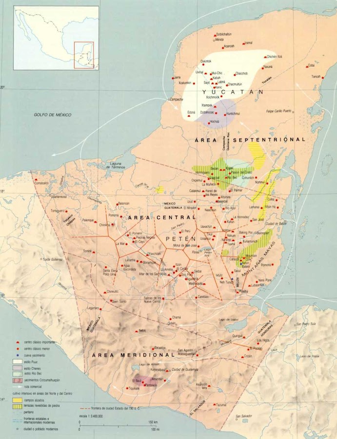 El territorio de los mayas abarcaba la casi totalidad de Guatemala, el occidente de Honduras, Belice, y los actuales estados de Yucatán, Quintana Roo, Campeche, parte de Chiapas y Tabasco, en México.