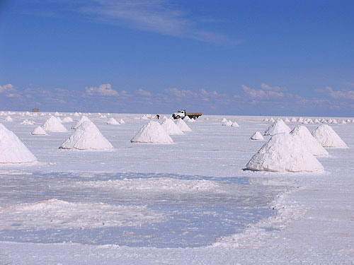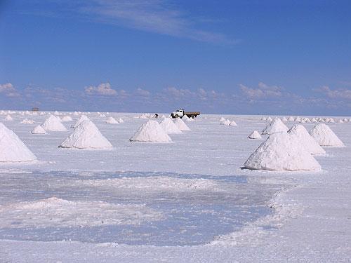En Bolivia se encuentra el desierto de sal más grande del mundo. Salar de Uyuni. Está ubicado en el departamento de Potosí, Bolivia, con una altura de 3680 metros sobre el nivel del mar y una superficie de 12.000 km². Lo que hace este lugar tan impresionante es el espejo de sal que se formo debido a la evaporación de antiguos mares. Está constituido por aproximadamente 11 capas de sal, cuyo grosor varía de los 2 metros a 10 metros. Se estima que la cantidad de sal que existe en este lugar es de 64.000.000 de toneladas, además que el salar es una de las mayores reservas de litio.