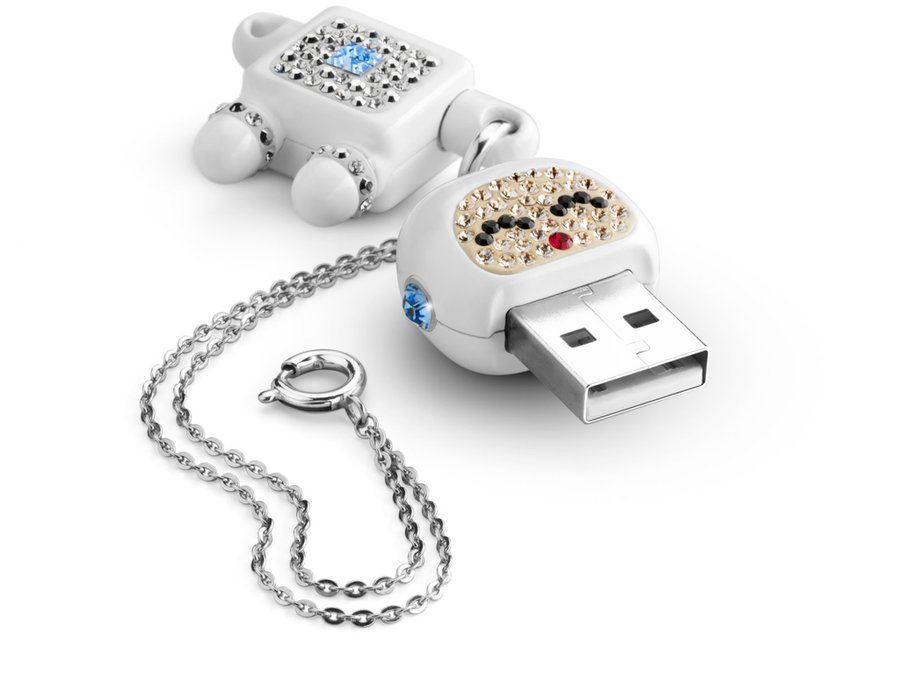 El lujo y el frikismo no tienen por qué estar reñidos. Un ejemplo perfecto lo encontramos en esta memoria USB de 2 GB de la marcha Philips, con forma de robot y decenas de cristales Swarovski incrustados por todo su cuerpo. Su precio es, lógicamente, mayor que el de una memoria USB convencional, pero a cambio tenemos una pequeña joya friki que podremos lucir en cualquier tipo de evento.