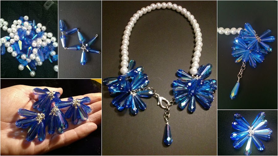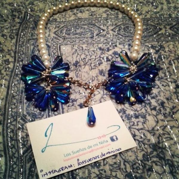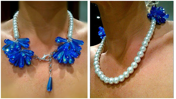 con cadena de acero hipoalergénico, perlas de vidrio prensado blanco nacarado de 10mm y perlas facetadas AB Shaphire de 20mm de cristal de Bohemia, formando cuatro flores en tonos azules, de lo más original, que estoy deseando estrenar.