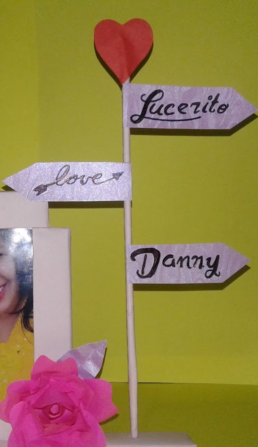 1. Como el reto consistía en Carteles, Flechas, Señales; primero elaboré las flechas, en cada una de ellas escribí 3 palabras (Los Nombres y la Palabra Love). Utilicé el palito brochetas y Cartulina.