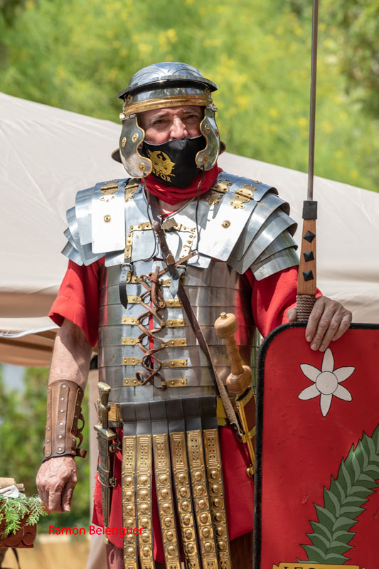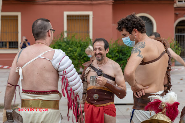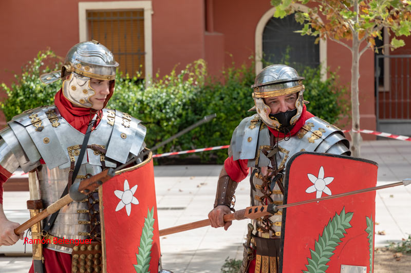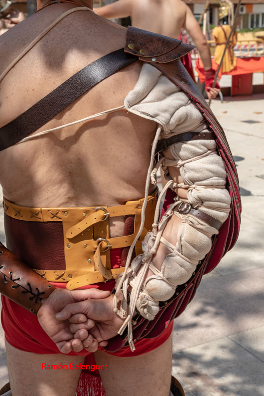 Samnitas: iban equipados como los guerreros del pueblo del mismo nombre. Llevaban un escudo oblongo, casco con visera y plumas, una greba en la pierna izquierda y una placa de metal o cuero que cubría el hombro y parte del brazo derecho. Como arma portaban una espada corta.