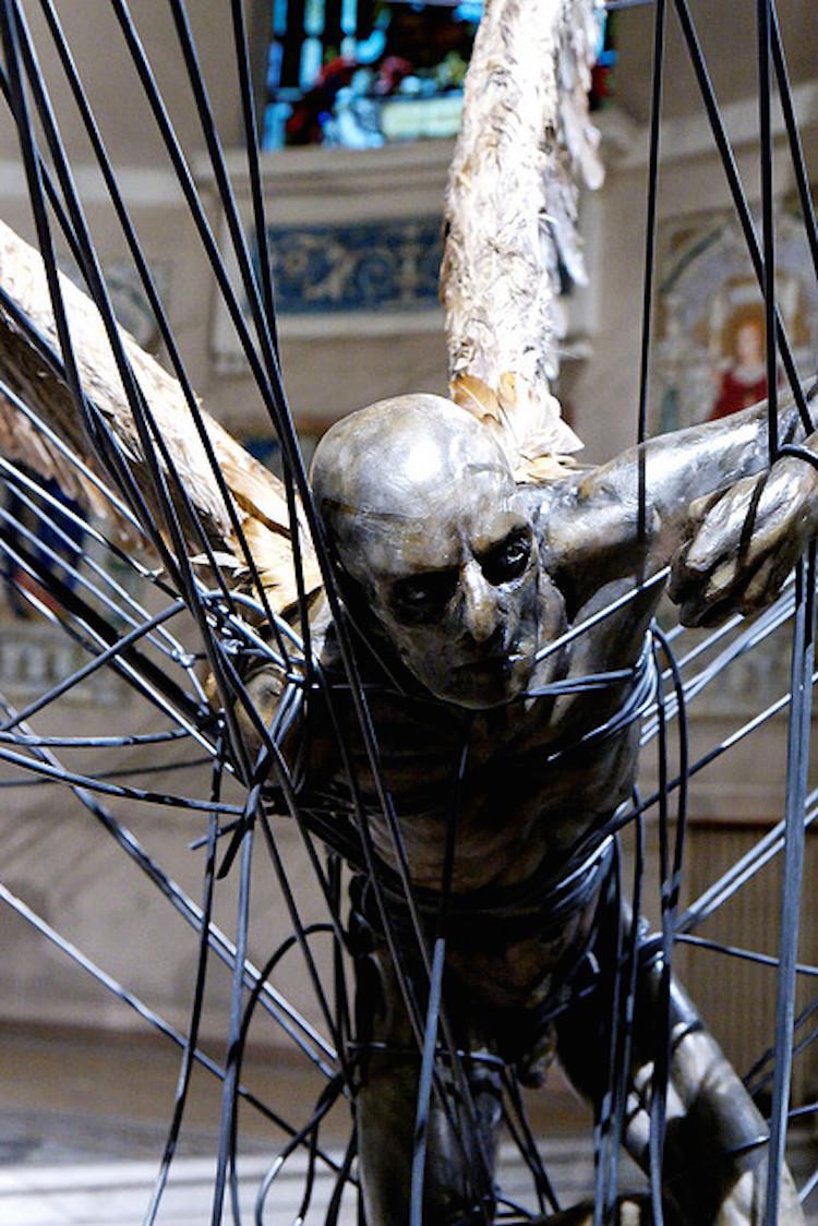 La pieza, titulada “Lucifer (Morningstar)” es una escultura de cera que representa al demonio atrapado en un conjunto de líneas eléctricas. La estatua es a partes iguales grotesca y hermosa, mostrando a Lucifer como una criatura aceitosa y negra con inmensas alas blancas (creadas a partir de plumas reales). Aún más espeluznante por el hecho de que está iluminado a través de las vidrieras de la iglesia, una yuxtaposición irónica que no se perderá en muchos años.