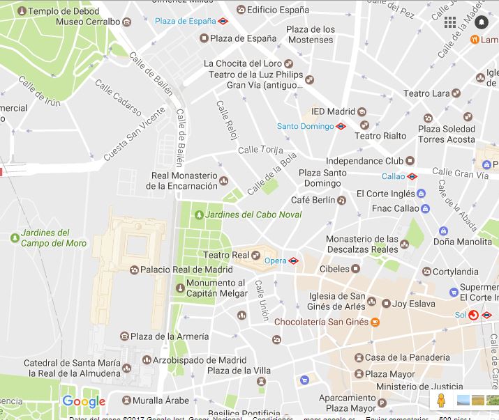 Mirando un mapa de Madrid a la izquierda de la Gran Vía podemos acercarnos a visitar el Real Monasterio de la Encarnación. Patrimonio Nacional. Fundado por la casa Real, viven monjas allí y sólo puede se puede ver con visitas guiadas previa reserva, aquí se encuentra una ampolla con la auténtica sangre de San Pantaleón. Miércoles y jueves tarde entrada gratuita.