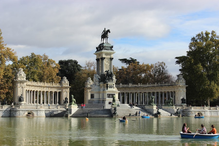 Monumentos dedicados a Benito Pérez Galdós, a Ramón y Cajal.Y ya llegamos al gran estanque del retiro, donde se alquilan las barcas de remo y está el Monumento de Alfonso XII.