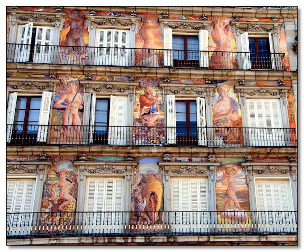 Y ya siguiendo la calle Toledo dirección norte llegamos a la plaza mayor. Tiene nueve puertas de acceso, de las cuales la más conocida es la del Arco de Cuchilleros. Rodeado de muchos restaurantes y sitios para poder comprar el típico bocadillo de calamares, por ejemplo en el bar la campana que está en la esquina.