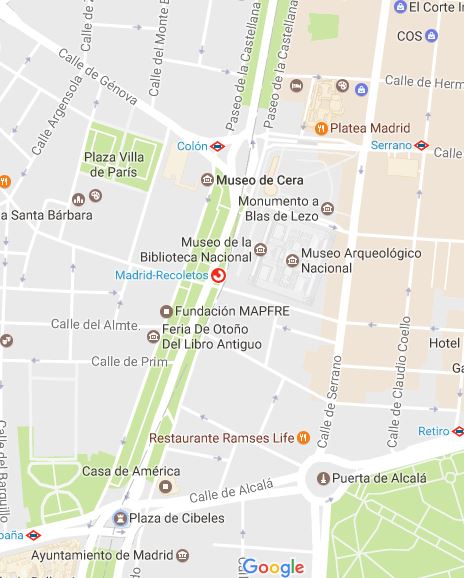 Y si no nos interesa pues seguimos por paseo de recoletos, al final antes de llegar a paseo Colón tenemos a la derecha el museo de la Biblioteca Nacional, es un museo moderno con una muestra sobre la historia de edición de libros, bibliotecas, cine y temas diversos en España. Si quieres ver la famosa sala de lectura, se debe tomar un tour guiado. La visita general es gratis.