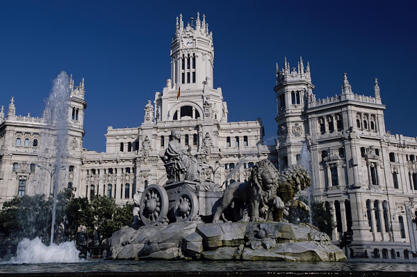 Estatua de la Cibeles con el Ayuntamiento de Madrid al fondo, palacio de Cibeles