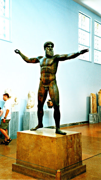 Ahora nos encontramos de frente con un dios, Poseidón, que parece a punto de lanzar su poderoso tridente. Unos pescadores encontraron su brazo en 1926 y tras buscar sin descanso en los alrededores del hallazgo, dos años más tarde apareció el resto del cuerpo. ésto ocurrió en cabo Artemisio.