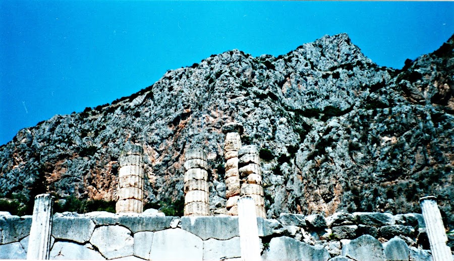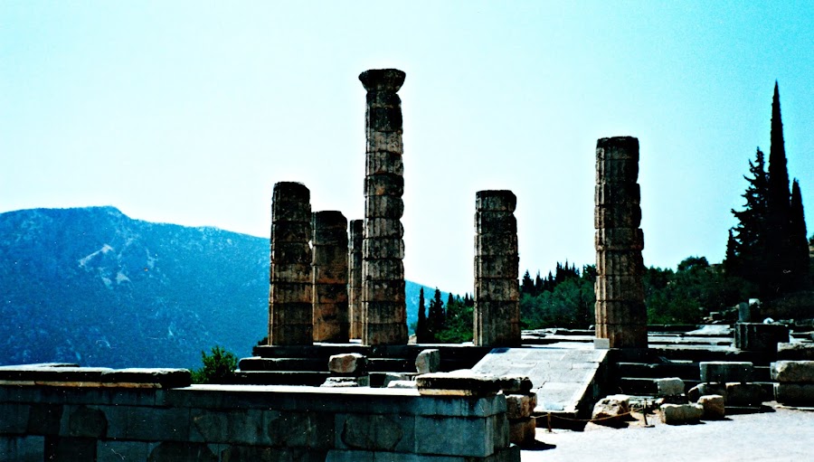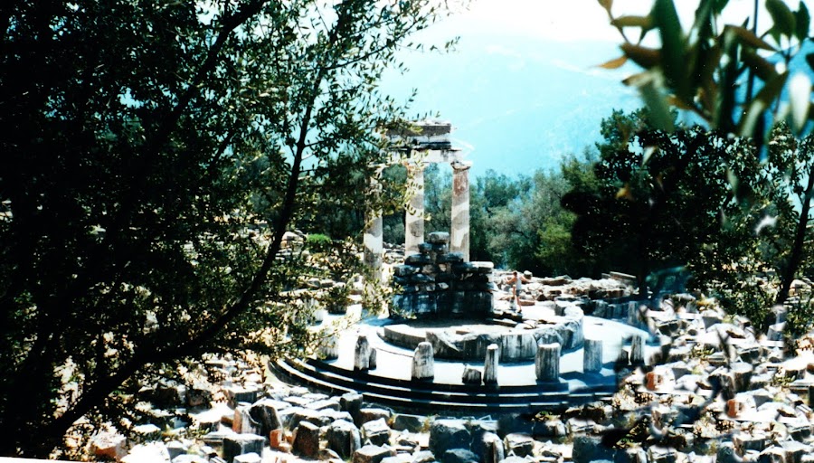 Como hay leyendas para todos los gustos y en todos los lugares, Delfos no iba a ser menos, ya que según una de ellas, dos águilas soltadas por Zeus en los extremos opuestos del mundo se cruzaron en Delfos, lo que hizo que el dios nombrara Delfos como el centro de la Tierra.En este punto tenía su punto principal el culto al dios Apolo y sobre todo su oráculo. Tras sacrificar un animal y pagar un impuesto podían escuchar por boca de la sacerdotisa o pitia las palabras del Dios, ya que ésta entraba en trance inducido por unos vapores tóxicos que emanaban de la tierra y contestaba a las preguntas formuladas por los viajeros.