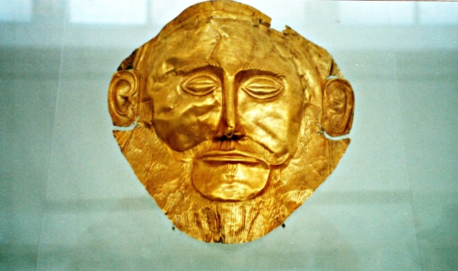 Seguiríamos con la Máscara de Agamenón, descubierta en las excavaciones de Micenas por Schliemann. Es de oro puro y se supone que representa al rey del mismo nombre.