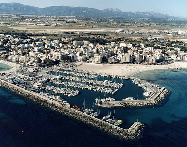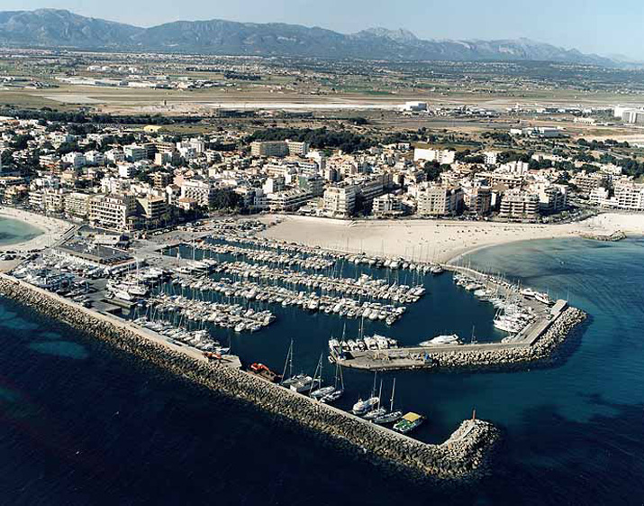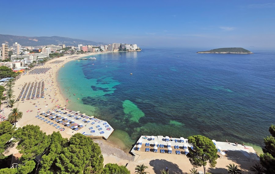 En la orilla está Port de Alcudia al lado de una inmensa playa de muro.