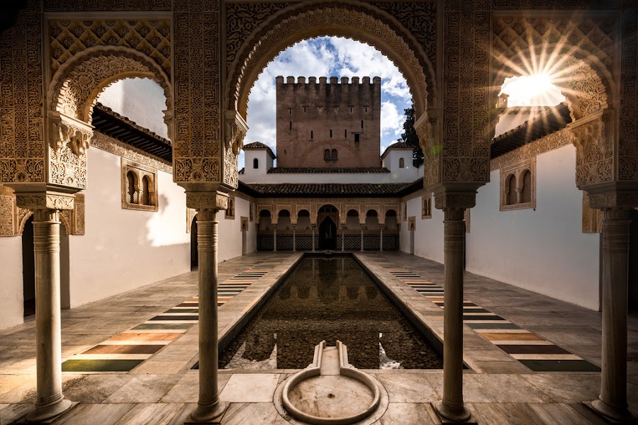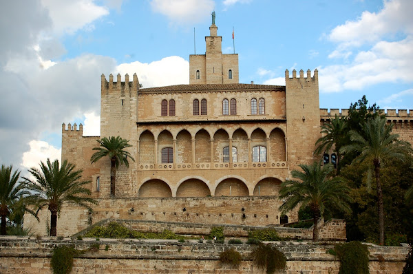 Justo enfrente tenemos el palacio de LAlmudaina, Álcazar Real de Palma, lugar donde hacen todos los años los reyes la recepción y una de sus residencias oficial de verano. El castillo actual, de origen romano, es una romano, es una modificación del Alcázar musulmán, un edificio de planta cuadrada rodeado por altas murallas y vigilada por torres de base cuadrada en donde destaca la Torre del Homenaje, también conocida como la del Ángel, ya que contiene una figura de bronce del arcángel Gabriel, antiguo patrón de la ciudad de Palma de Mallorca. Tiene una entrada elevada, rodeado de escaleras. Miércoles y jueves por la tarde si eres europeo es gratis.