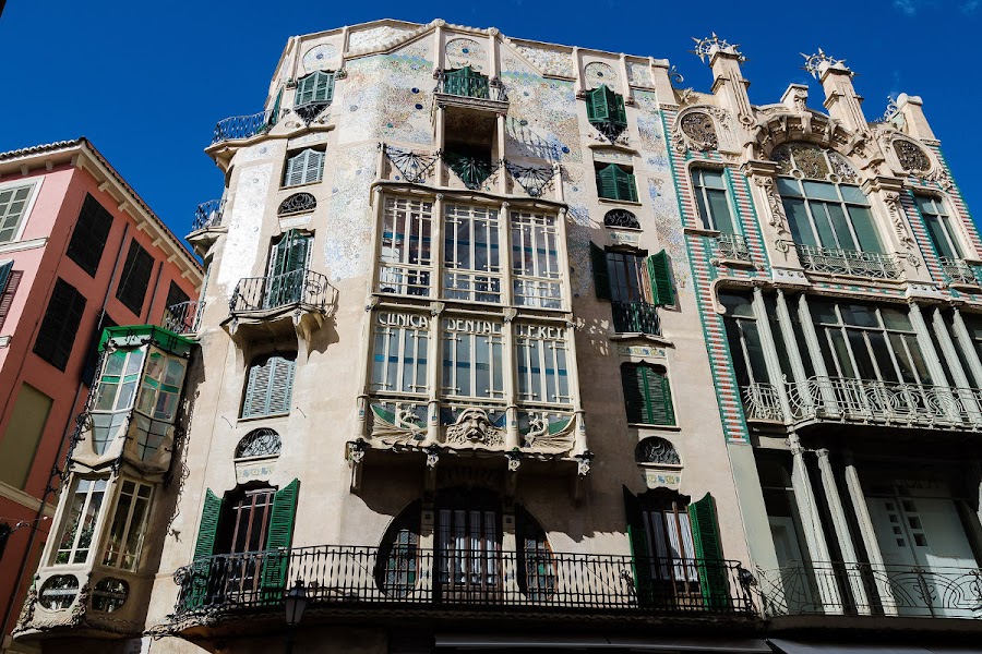 Can Forteza Rey. este edificio responde a la tendencia modernista de Art Nouveau, que excepcionalmente prolonga la decoración estilística de la fachada al diseño interior, haciendo muestra de una fuerte influencia del modernismo catalán.