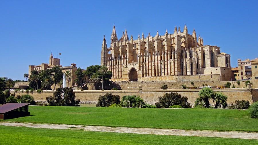 La catedral. En mallorquín se le conoce como la Seu o Seo, templo gótico con su gran rosetón, el mayor del mundo. Se erige sobre las murallas romanas y renacentista que la separan del Mediterráneo. Sobre las 12 del mediodía el sol penetra por el rosetón. Para verla desde fuera nos paramos en la carretera en un ladito para hacer la foto. En horario de misa se puede entrar gratis.