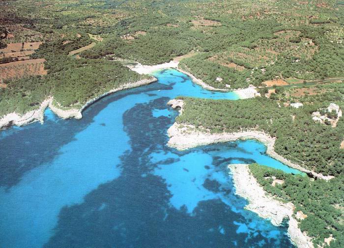 El Parque Natural de Mondragó. Ocupa una superficie de 766 hectáreas. Se caracteriza por la actividad agrícola y ganadera que durante siglos se ha desarrollado en la zona y que la dota de un paisaje muy particular. Por esto, destacan la gran cantidad de muros de piedra seca y las cabañas o casas de aperos. Sus dos salidas al mar son Cala Mondragó y SAmarador. Siguiendo el sur más calas, cala Figuera, cala Santanyi Diving, en esta cala se hacen cursos de buceo. En la imagen se ve las tres calas del parque.