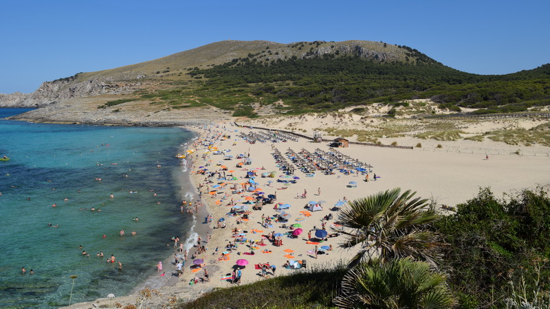 Y más adelante la playa virgen y nudista de Sa Canova. Sin embargo una cala que me encantó fue cala Mesquida. Está a 7Km de la localidad de Capdepera. Llena de senderos, aguas cristalinas. Fácil aparcamiento y acceso, hay una roca que divide la playa en dos, a la izquierda los textiles y a la derecha los nudistas. La cala termina en un sistema dunar, destaca la duna Munt Gros. Yo en el fondo tengo muy mal recuerdo porque me estaba bañándo en el extremo izquierdo junto a las rocas y notaba que me metía la corriente para dentro y si no llega a ser por mi marido que me tranquilizó, no lo cuento. No sé para que estaba el socorrista allí a lo lejos que ni miraba siquiera.