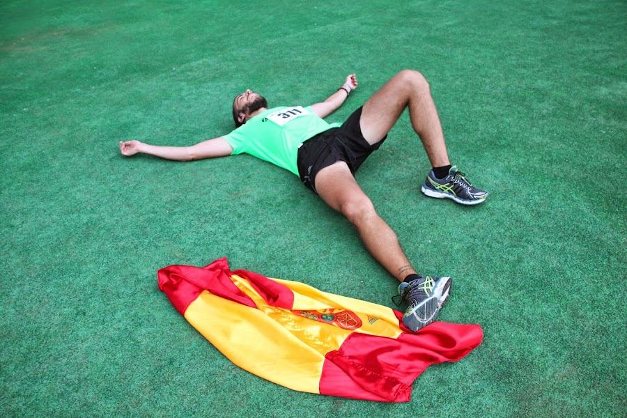 Lo que no he contado, es que mi amiga Anna, catalana independentista de postín, y a la vez gran persona y amiga, cogió mi bandera de España, la dejó a la entrada del estadio e hice el recorrido del óvalo con la bandera ondeando en mis brazos. Sonaba en mi cabeza, que no en mi ipod que se había quedado sin batería, la BSO de Carros de Fuego. Fueron sin duda unos de los mejores 400 metros corriendo de mi vida y cuando el Speaker de la prueba dijo: "Ahí viene el español", entrando en meta y fundiéndome en un abrazo con Anna, la emoción no pude contenerla.