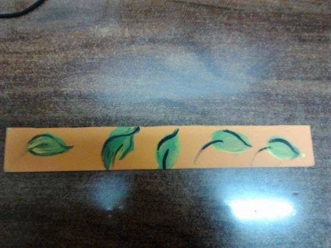 Con un material duro parecido al cartón, medido con regla, he pintado esta vez, el fondo anaranjado, una vez seco he pintado las hojas y algo delineadas con color negro.