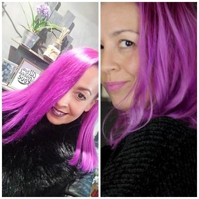 Como puede apreciarse en la primera foto (izq) , la base está aclarada al máximo de su capacidad por lo que cualquier tonalidad aplicada encima tendrá el máximo de su intensidad. En la segunda foto, me apliqué la mascarilla de color Nirvel tono violeta , a pesar de que la etiqueta es de un tono violeta pastel sobre mi base (foto central) adquiere una intensidad muy elevada más tirando al fucsia. En la última foto (der), apliqué la mascarilla de color Nirvel tono berenjena sobre el matiz que llevo en la foto central (violeta).