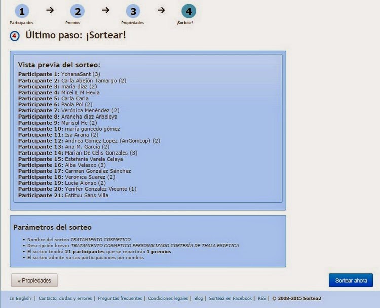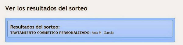 Por otra parte, os dejo el nombre de la ganadora del sorteo del maravilloso tratamiento cosmético personalizado, cortesía del centro de Spa/Belleza/Cuidado Personal Thala, realizado a través de Sortea2 y cuyas bases publicaba aquí el 27 de abril,