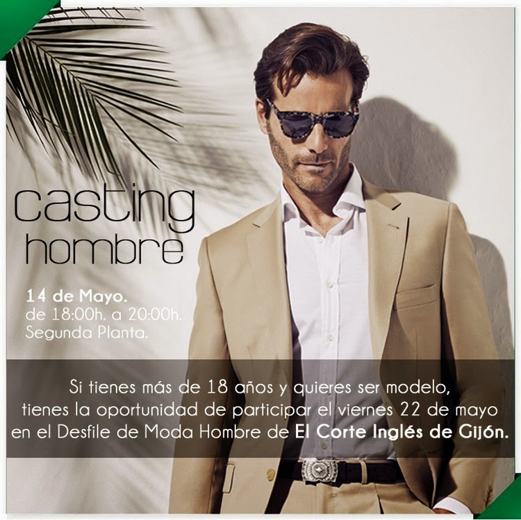 Os informo también de que mañana jueves, día 14 de mayo, de 18 a 20 horas, en la segunda planta de El Corte Inglés de Gijón, tendrá lugar un CASTING de MODA HOMBRE, por si queréis animar a participar a vuestro chico, marido, hermano o primo a convertirse en modelo por un día y vivir una experiencia única. Los elegidos podrán desfilar el viernes día 22 en la presentación de la Moda Hombre de El Corte Inglés de Gijón. Por lo pronto, yo mañana estaré en calidad de Jurado.