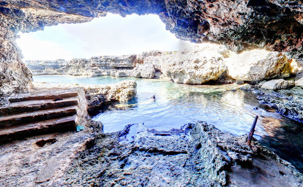 Pequeña cala de aguas turquesas. Acceso complicado a través de una bajada que es casi toda una rampa y en la parte final escaleras. Hay parking cerca y un chiringuito antes de bajar a la cala.