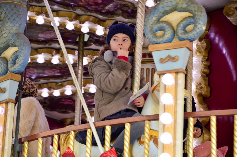 Todo empieza con una puerta de madera iluminada que nos va anunciando la entrada al mercado de Navidad. El rico olor a castañas asadas nos va guiando por el camino de la izquierda, así que esa será nuestra primera parada, y junto al puesto, un precioso carrusel, hace que sea la segunda, y aunque acabamos de empezar ya va quedando menos para encontrar a Papá Noel.