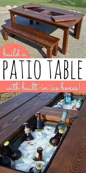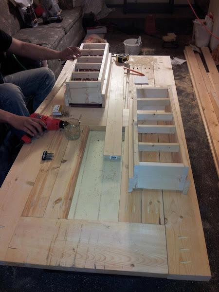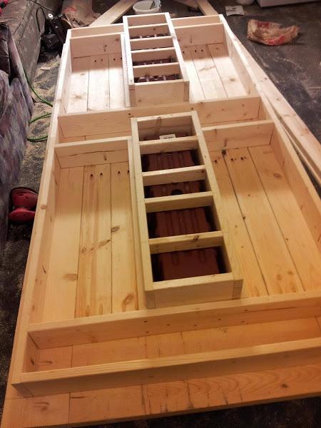 Como se puede apreciar, por la parte de abajo, se han hecho dos estructuras de madera para colocar dentro los recipientes de plástico, metal u otros materiales resistente a la humedad. Se practican los dos huecos en la mesa se atornillan las estructuras de madera y ya están listas para poner las "cubiteras". Además también se pueden adaptar unas tablas (las mismas que se han cortado de la mesa) a modo de tapaderas para cuando no se quiera utilizar las cubiteras y ganar espacio en la mesa, como podéis ver en la imagen de abajo.