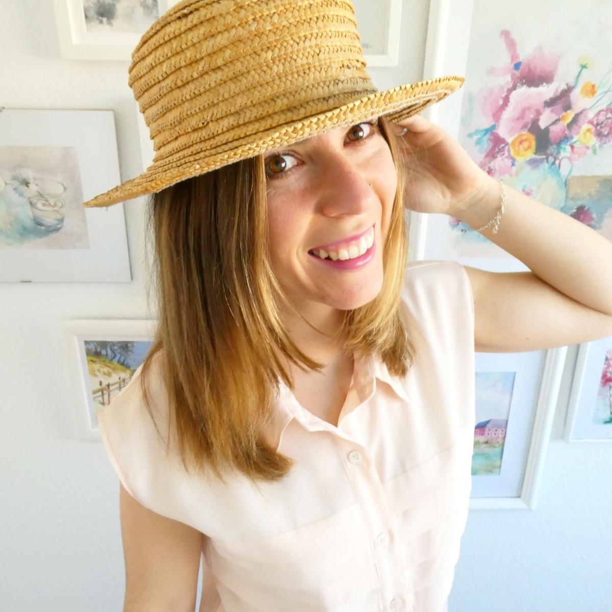 Tenía una foto de un paisaje que sustituí por la que tengo ahora con la que me siento muy representada: miro a la cámara y sonrío con el fondo de mis acuarelas llevando una camisa de mi madre (que ajusté a mi talla) y un sombrero de paja que no me falta cuando llega el verano.