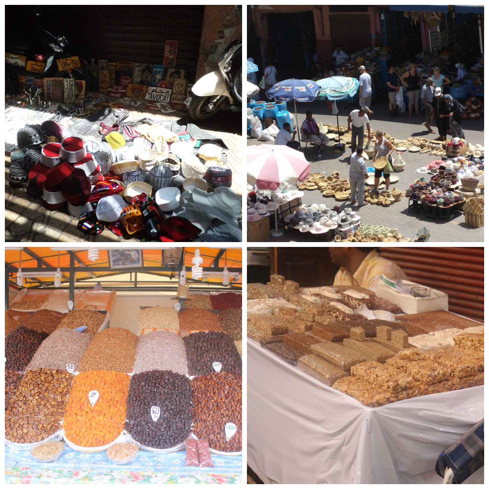 Vendedores ambulantes de tarbush (gorros para hombres), cestas, frutos secos y turrón marroquí.