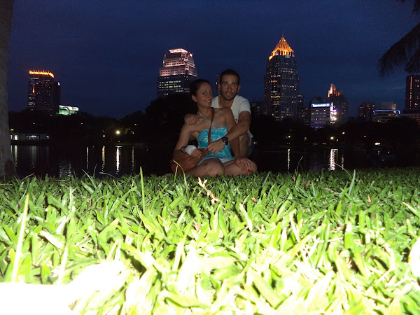 Al anochecer (sobre las 6-7) fuimos al Lumpini. Parecía bastante seguro, había policias, la gente estaba haciendo deporte, incluso me animé a unirme a un grupo improvisado de aerobic!! ver el anochecer allí fue una pasada, los rascacielos se iban iluminando a nuestro alrededor (podéis ver nuestra foto). Descansamos un rato y respiramos algo de aire, me gustó ver a los Tailandeses en su tiempo de ocio, me pareció curiosa su manera de correr, no parece que se estresen mucho. El calor y el cansancio empezó a hacer mella y decidimos volver paseando. Casi no me respondían las piernas, el día fue agotador y decidimos no volver a darnos paseos taaaan largos... el mapa parece pequeño pero Bangkok no lo es! No cene si quiera, el cansancio y el calor me quitó las ganas de comer y me encontraba incluso mal, mi novio bajó al restaurante del hotel (algo que en España sería un lujo no permitido) y se comió una hamburguesa, algo más cara que en la calle pero que no llegaba a 4 euros con patatas.