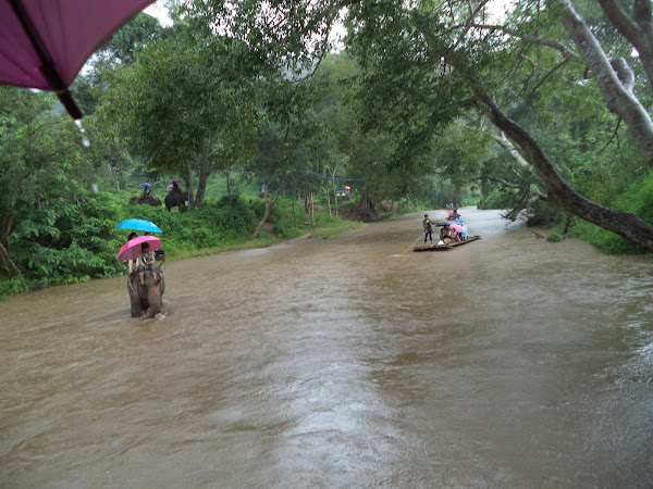 Luego subimos en la van al mismo sitio y el grupo se dividió por que no era el mismo tipo de excursión. Una pareja italiana y nosotros fuimos a montar en elefante. Aprovechamos para acariciar un elefante pequeño que había mientras llegaba nuestro turno. El paseo en elefante fue divertido hasta que empezó a diluviar mientras cruzábamos el río, menos mal que el chico que dirigía el elefante sacó un paraguas, entonces lo divertido fue ver a los que bajaban en barcas de bambú empapados... ellos también se reían...sobre lo de los elefantes tengo que decir que desde arriba marea y no me gusta mucho como trataban a los animales, le daban con un pico en la cabeza y nunca paraban, a lo mejor un minuto para que comiesen algo si tu se lo comprabas o lo cogiesen del suelo. Yo recomiendo buscar algún paseo en elefante más ecológico, que no exploten tanto a estos animales.