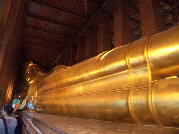 Al salir empezamos a andar dándole vueltas al mapa y conseguimos llegar a donde está el Budha inclinado, entramos gratis, sin querer por que entramos por una puerta que era de los monjes o algo así. Mi novio, que pasaba de volverse a quitar los zapatos para ver este Budha se quedó fuera, pero me gustó tanto que salí a buscarle. Es genial, no os lo podéis perder, es enorme!!!