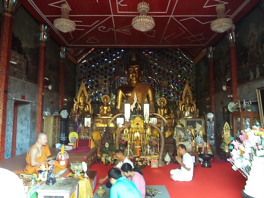 Un vez en Doi Suthep me decepcionó un poco las escaleras, en fotos parecían más empinadas y antiguas, pero aún así he de decir que son muy bonitas y muchas jajaja. Las campanas si las tocáis dan suerte, el templo hay que ir con pantalón largo y camiseta de mangas cortas (como en todos los templos que no lo he dicho antes, excepto en Ayuthaya que están al aire libre) aunque si no lo tenéis os dejan un pareo y pañuelos. Aquí había un monje que nos dio la bendición echándonos agua mientras te acercas de rodillas porque no puedes estar más alta que él (se ve en la foto). Fue un poco cómico para nosotros, es muy de guiris, y por un momento vi a mi chico salpicado de agua arrastrándose de rodillas y decía no sé que para que es esto... la verdad no nos gusta hacer estas cosas que no son de nuestras creencias, es como si te vieras a un guiri en semana santa cantando saetas sin saber que dice, lo que pasa que el guía del grupo nos dijo que nos iban a poner una cuerdecita como pulsera o no sé que y lo hizo todo el mundo pues alaaa rebañooo!! Otros chicos españoles se animaron a introducirse en la cultura llevando una ofrenda de flores y meditando. Yo preferí mirar como lo hacen los locales esta vez.