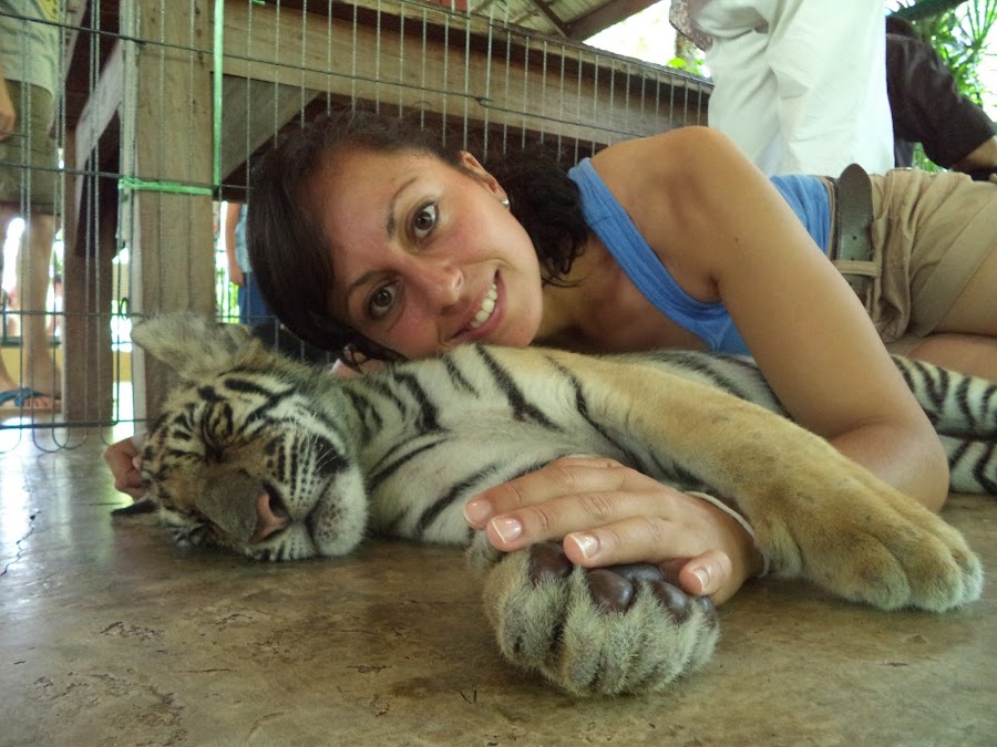 A mi novio no le hacía especial ilusión lo de los tigres así que los vió desde la puerta y se fue al restaurante a comerse un helado mientras se conectaba al wifi. Yo cogí los tigre pequeños, otra turistada, la verdad que no se si merece la pena lo que vale (unos 15 euros) pero a mi me gustó. El chico que les vigilaba me hizo un montón de fotos con mi cámara, pero tigre que yo acariciaba tigre que se dormía... Dicen las malas lenguas que están drogados pero yo creo que pasan de la gente. Cuando dejé de acariciar uno que dormía se puso a jugar con otro, también vi que están muy limpios, tal vez deberían estar sueltos pero estos animales nacen en cautiverio. Después de mis 15 minutos acariciándole, observándole y mi reportaje de fotos fui a ver el resto de jaulas. Al salir vi a mi chico que me decía -¿que te parecen?¿muy monos y quieres uno para casa?- y la verdad que era así jajajaja. Nos fuimos en el mismo tuk tuk, el chico dormía dentro y tuvimos que despertarle...ups!