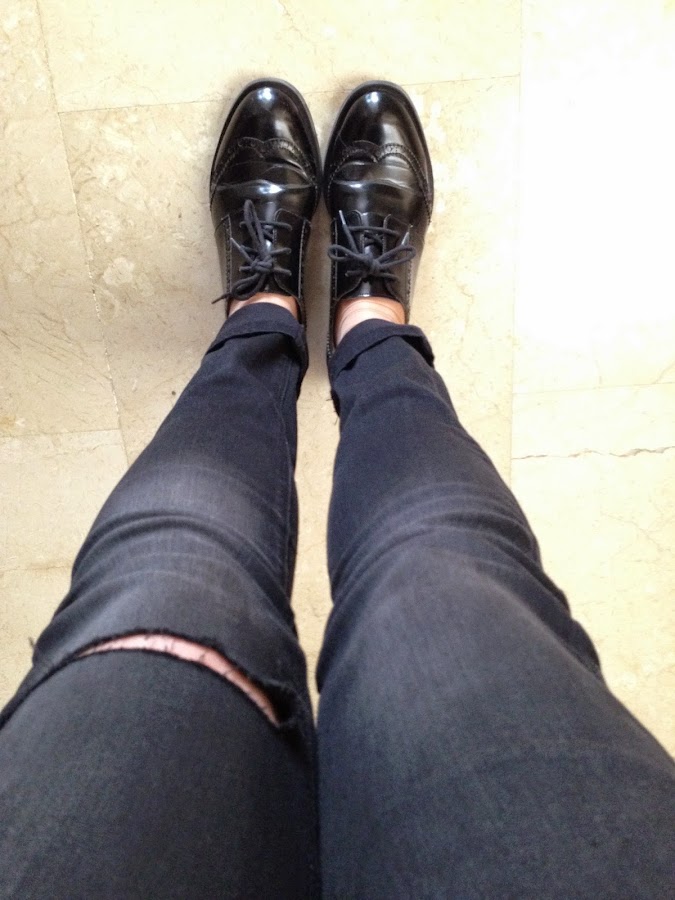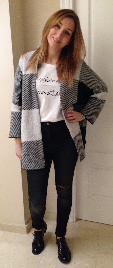Aquí os dejo unas fotos donde podéis ver cómo la combiné yo el otro día, aunque hay mil posibilidades, porque una camiseta blanca y negra es tan versátil...¡me encanta! El poncho es de Stradivarius, los pantalones negros de tiro alto también y los blucher de Zara de la temporada pasada. :)