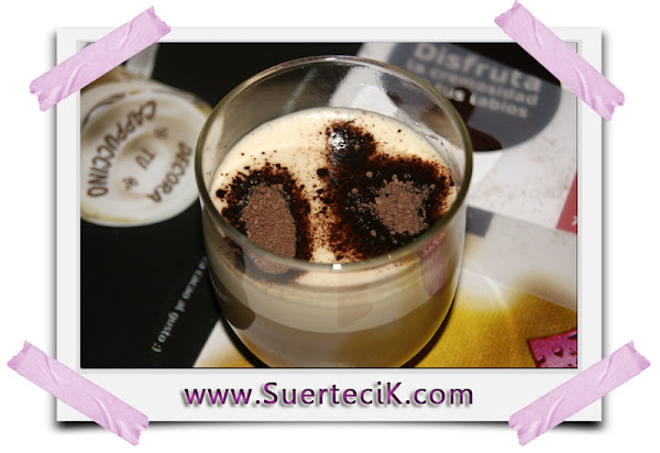En un momento está listo para beber, con agua ó con leche como prefiráis y si queréis añadirle un poquito de cacao por encima... yo he usado las plantillas que vienen en el proyecto para hacer los dibujos en la espuma (este es el dedito arriba de "Me gusta") pero creo que no es lo mío jajaja ó quizás con la práctica...
