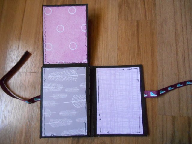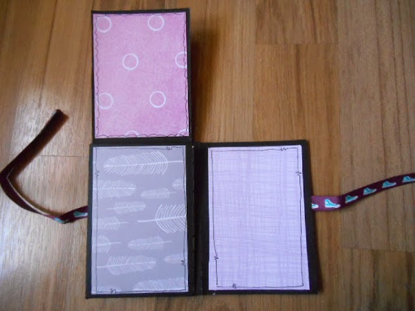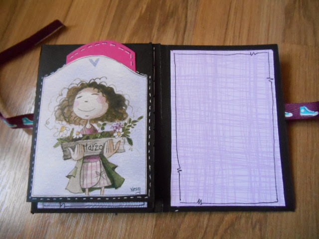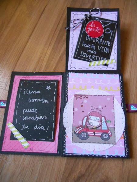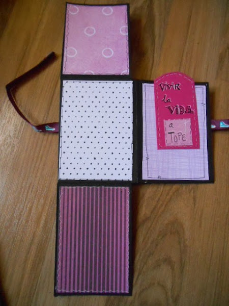 Este mini está hecho tambien de una sóla pieza con una cartulina de 30*30 y aprovechando los papelitos que me quedaban, también en tonos rositas y lilas, jajaja!! la muñequita la he sacado de la un folleto de publicidad que me encantó.