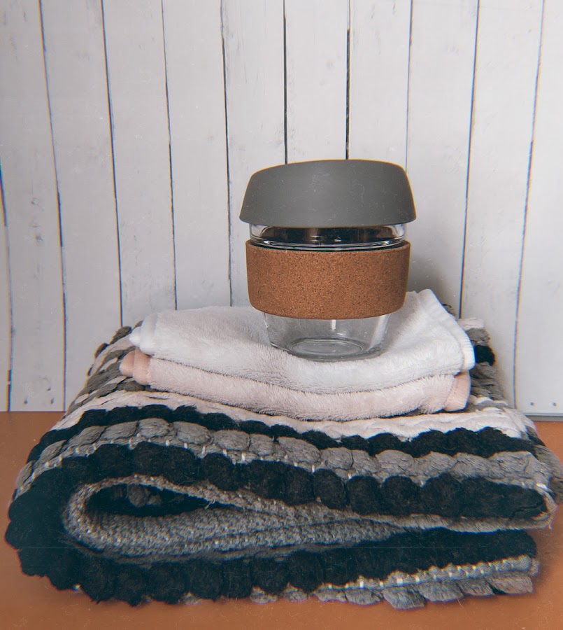 Vaso de café de vidrio. Hace año y medio lo vi en su perfil en internet y me fui corriendo a por el. Y menos mal, porque no los he vuelto a ver y me encanta. Tiene el tamaño ideal para un café. La tapa es de silicona y el protector de corcho, ¡Cero residuos! (Y si lo llevas a Starbucks te hacen descuento.