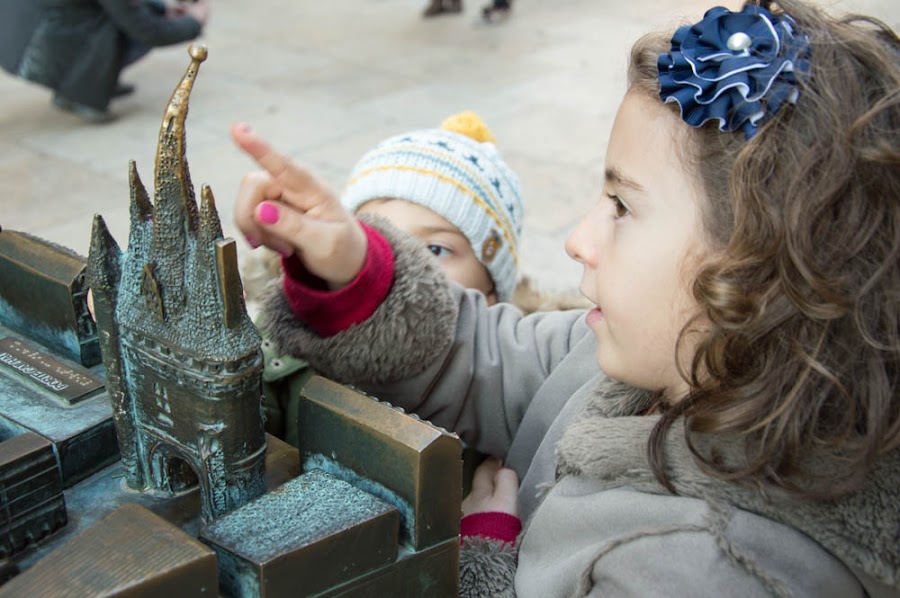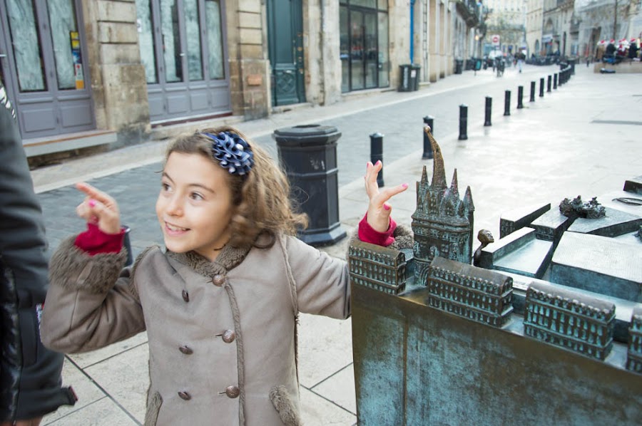 Plaza del Palacio (Place du Palais); otro espacio sin peligro de coches, así que de nuevo, aprovechamos para escuchar música navideña en directo, echar unos bailes con los niños y parar para observar una pequeña escultura sobre el plano de la antigua Burdeos, donde encontramos la Puerta de Cailhau, también en miniatura.