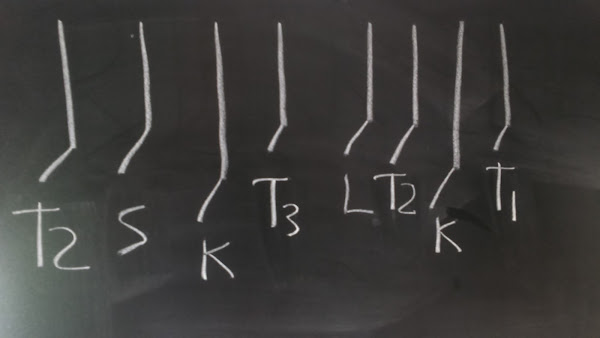 De nuevo, he usado una nomenclatura super dificil y complicada. "T2" es para referirnos al tom 2, "T3" al tom 3 o base y "S" para referirnos a la caja. En este caso, también queda muy bien que acentuéis los golpes en los toms y hagáis muy piano (flojito) los golpes en caja.