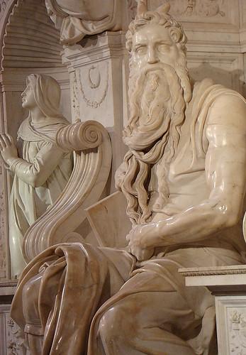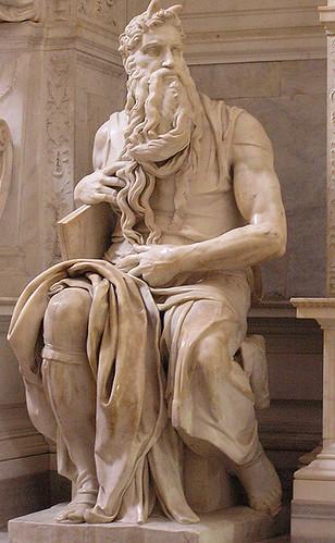 Esta escultura de mármol que representa al personaje más interesante de las Sagradas Escrituras es una obra (como no¡) de Michelangelo Buonarroti (1513-1515 tiempo de su realización) que en un principio estuvo concebida para la tumba del Papa Julio II en la Basílica de San Pedro, un proyecto colosal que debía dar al gran artísta todo el espacio que necesitaba para sus seres más que humanos y quizás incluso más que legendarios. El proyecto original estaba compuesto por una estructura independiente, sin apoyo ninguno con tres niveles y aproximadamente 40 estatuas y sin embargo el Papa sin mediar palabra quitó la ayuda para el proyecto para dárselo a Bramante que estaba haciendo obras en San Pedro de Roma.