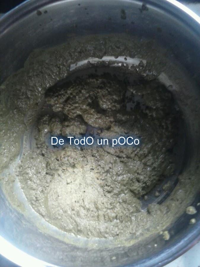 Ahora vamos a poner una olla o caserola que sea lo suficiente mente grande, en la lumbre agregamos la media taza de aceite o manteca lo que eligamos o bien podemos combinar la mitad y la mitad, cuando este caliente bajamos la temperatura y agregamos el polvo de mole verde en ese momento nos daremos cuenta si nesecitamos agregar mas aceite o manteca puesto que el polvo lo absorbe y se forma una pasta no nos debe de quedar muy seca, por lo cual agregaremos un poquito mas de aceite o manteca de ser necesario, lo vamos a freír a fuego bajo hasta que cambie de color a un verde un poquito mas obscuro cuidando que no se nos queme.