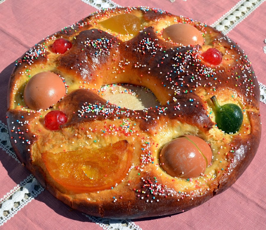Transcurrido el tiempo amasamos para retirar el gas que se ha producido en su interior y damos la forma que queramos, aquí por lo general se hace una forma redonda y en el centro se le coloca un huevo cocido decorado, o bien en forma de rosco y se le añade un huevo duro o dos (a lo que yo llamo mono, jojo), una vez conseguida la forma deseada pintamos con un huevo batido y luego decoramos al gusto con fruta confitada y bolitas de anís.