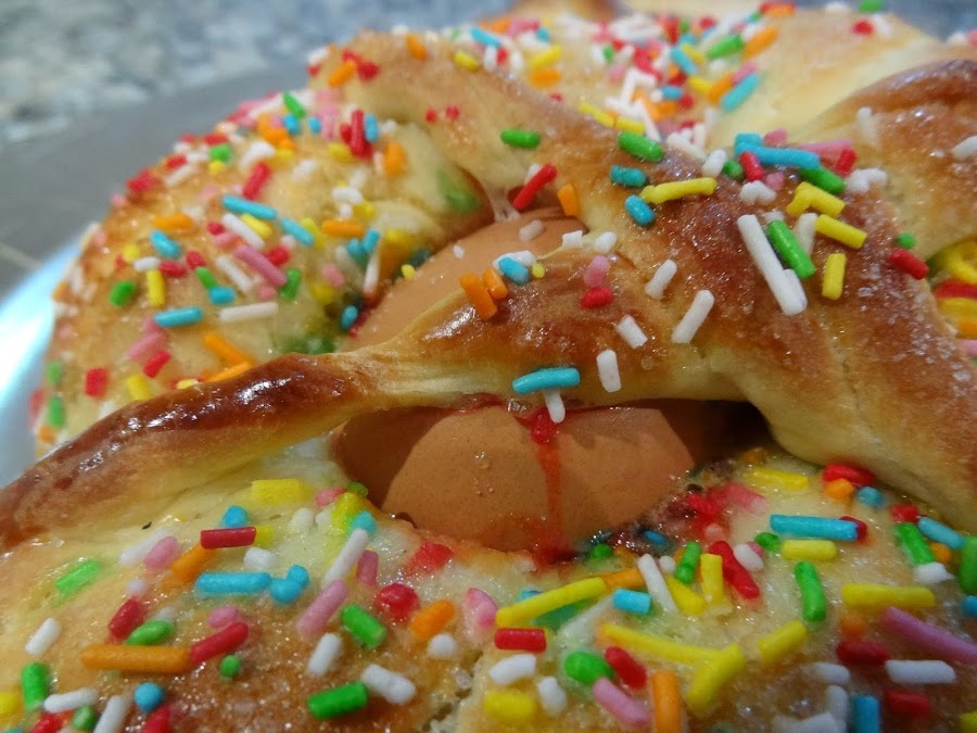 Transcurrido el tiempo amasamos para retirar el gas que se ha producido en su interior y damos la forma que queramos, aquí por lo general se hace una forma redonda y en el centro se le coloca un huevo cocido decorado, o bien en forma de rosco y se le añade un huevo duro o dos (a lo que yo llamo mono, jojo), una vez conseguida la forma deseada pintamos con un huevo batido y luego decoramos al gusto con fruta confitada y bolitas de anís.