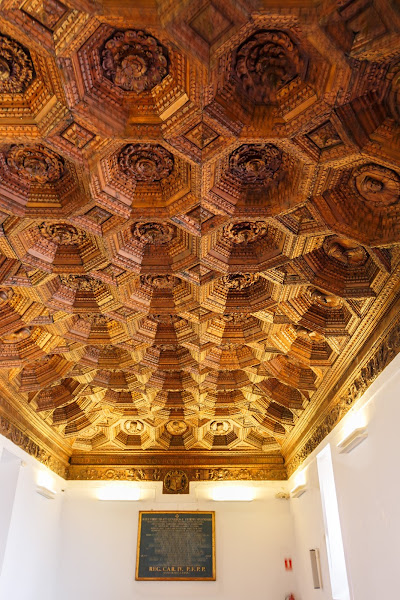 Espectacular artesonado del techo del refectorio con casetones hexagonales